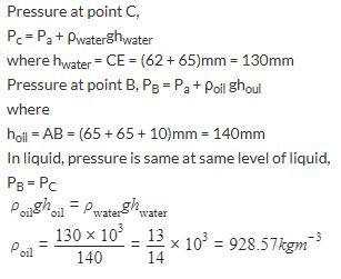 A U tube with both ends open to the atmosphere, is partially filled with water. Oil, which is immiscible with water, is poured into one side until it stands at a distance of 10 mm above the water level on the other side. Meanwhile the water rises by 65 mm from its original level (see diagram). The density of the oil is