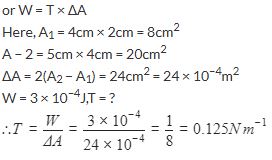 A rectangular film of liquid is extended from (4cm × 2cm) to (5cm × 4cm). If the work done is 3 × 10−4J, the value of the surface tension of the liquid is