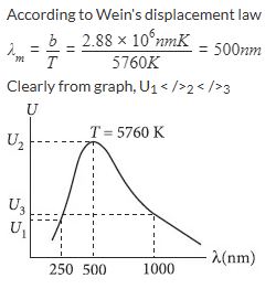 A black body is at a temperature of 5760 K. The energy of radiation emitted by the body at wavelength 250nm is U1, at wavelength 500 nm is U2 and that at 1000 nm is U3 Wien's constant, b = 2.88 × 106nmK. Which of the following is correct?