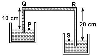 A siphon in use is demonstrated in the following figure. The density of the liquid flowing in the siphon is 1.5 gm/cc. The pressure difference between the point P and S will be: