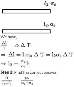 Two rods, one made of aluminium and the other made of steel, having initial lengths l1 and l2 are connected together to form a single rod of length l1 + l2. The coefficient of linear expansion for aluminium and steel are αa and αs respectively. If the length of each rod increases by the same amount when their temperature is raised by t°C, then the ratio