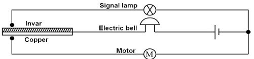 The diagram shows a bimetallic strip used as a thermostat in a circuit. Copper expands more than Invar for the same temperature rise.