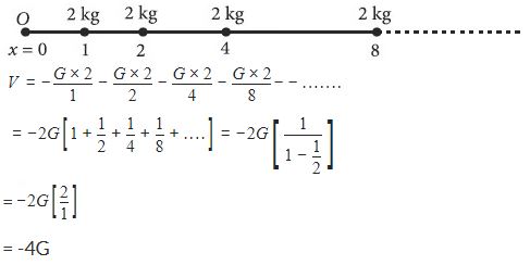 Infinite number of bodies, each of mass 2 kg are situated on x-axis at distances 1 m, 2 m, 4 m, 8 m ,..., respectively, from the origin. The resulting gravitational potential due to this system at the origin will be