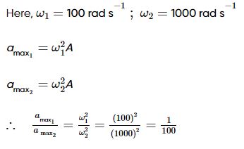 Two simple harmonic motions of angular frequency 100 and 1000 rad s–1 have the same displacement amplitude. The ratio of their maximum acceleration is
