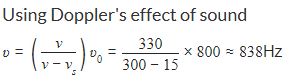A siren emitting a sound of frequency 800 Hz moves away from an observer towards a cliff at a speed of 15ms−1. Then, the frequency of sound that the observer hears in the echo reflected from the cliff is