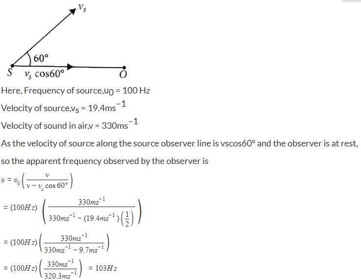 A source of sound S emitting waves of frequency 100 Hz and an observer O are located at some distance from each other. The source is moving with a speed of 19.4 m s'1 at an angle of 60° with the source observer line as shown in the figure. The observer is at rest.