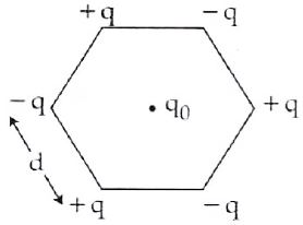 Six charges +q, −q, +q, −q, +q and − q are fixed at the corners of a hexagon of side d as shown in the figure. The work done in bringing a charge q0 to the centre of the hexagon from infinity is: (ε0. - permittivity of free space )