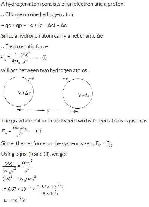 Suppose the charge of a proton and an electron differ slightly. One of them is -e, the other is (e+Δe). If the net of electrostatic force and gravitational force between two hydrogen atoms placed at a distance d (much greater than atomic size) apart is zero, then Δe is of the order of