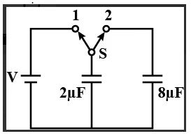 A capacitor of 2 μF is charged as shown in the diagram. When the switch S is turned to position 2, the percentage of its stored energy dissipated is