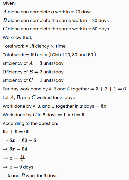 A alone can complete a work in 20 days, B alone can complete the same work in 30 days and C alone can complete the same work in 60 days. They work together for some time, then A and B left the work. If C completes the remaining work in 6 days, then A and B work for?