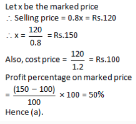 A person sells a book for Rs.120 at a discount of 20% on the market price. Thus he gets a profit of 20%. If he sells it at the marked price, what is his profit percentage?