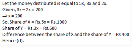 A sum of money is to be distributed among X, Y and Z in the ratio 5 : 3 : 2. If Z receives Rs.200 less than Y, then by how much is X’s share more than that of Y?