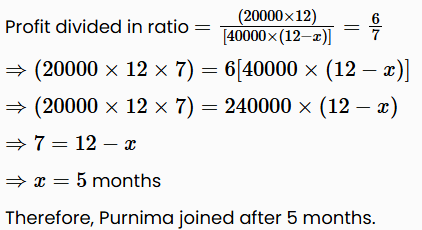 Kamal started a business with Rs. 20000. After some time, Purnima joined her with Rs. 40000. At the end of the year, profit was divided between them in the ratio 6 : 7. After how many months Purnima joined the business?