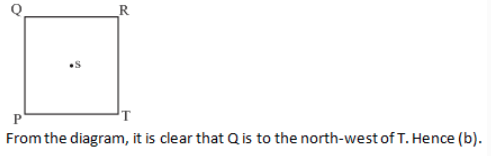 4 people amongst P, Q, R, S and T stand at the corners of a square and the fifth person stands at the centre of the square. R is to south of T. S is to the south-west of R. If P is equidistant from Q and T, then in which direction of T, does Q stand?