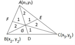 If \(A\left(x_{1}, y_{1}\right), B\left(x_{2}, y_{2}\right)\) and \(C\left(x_{3}, y_{3}\right)\) are the vertices of a triangle. If \(G\) be the centroid upon one of the median (say) \(A D,\) then \(A G: G D=2: 1\)