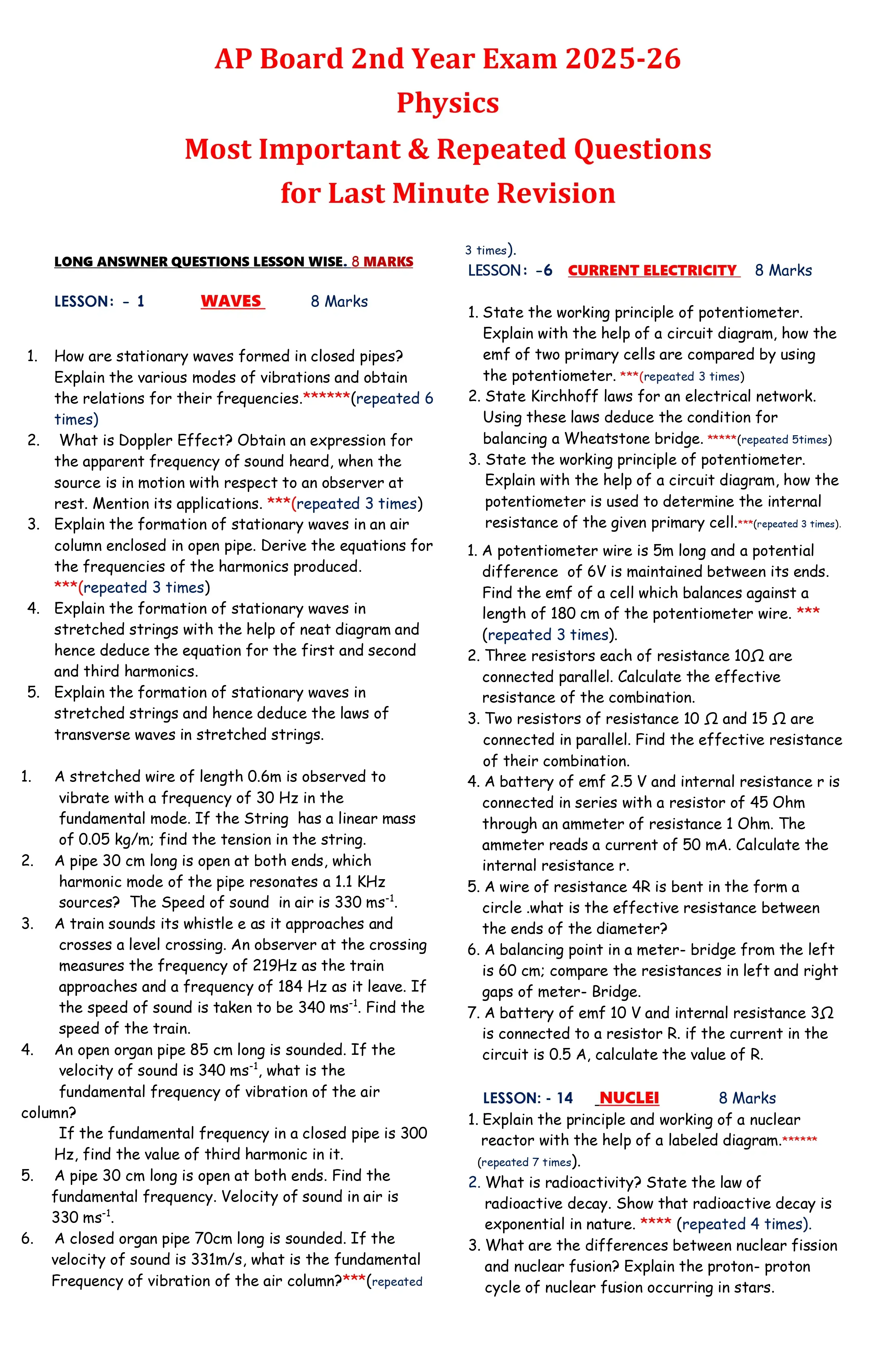 AP Board 2nd Year Physics Most Important & Repeated Questions 2025-26 – Free PDF Download