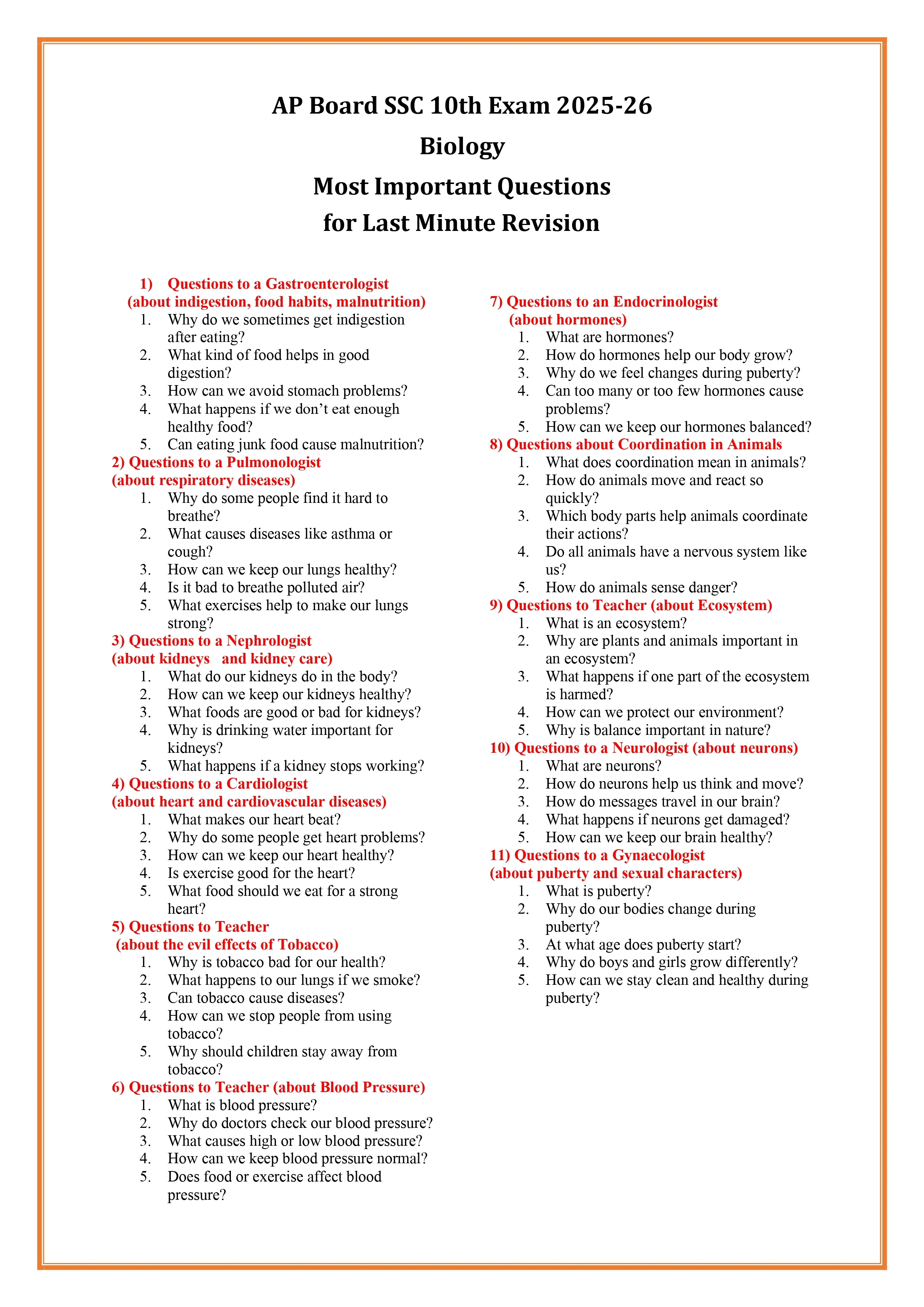 | AP Board SSC Biology Exam 2025-26 Most Important Questions PDF |