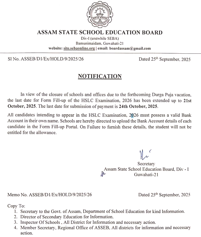 Assam HSLC Exam 2026 Form Submission Deadline Extended to Oct 21