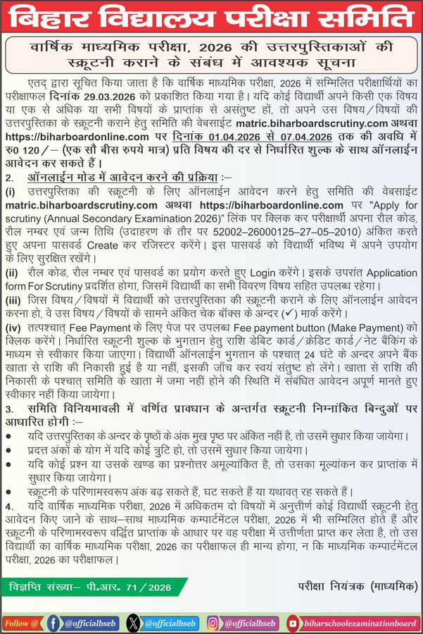 Bihar Board 10th Result 2026: स्क्रूटनी और कंपार्टमेंट के लिए आवेदन शुरू — 7 अप्रैल है आखिरी तारीख
