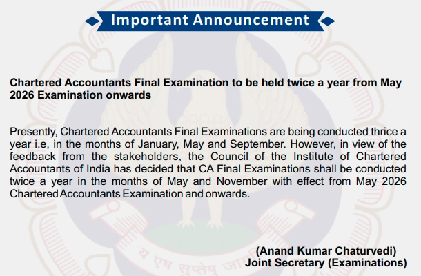 In its official notice, the ICAI stated: "Currently, the Chartered Accountants Final examinations are being conducted three times a year—specifically in the months of January, May, and September.