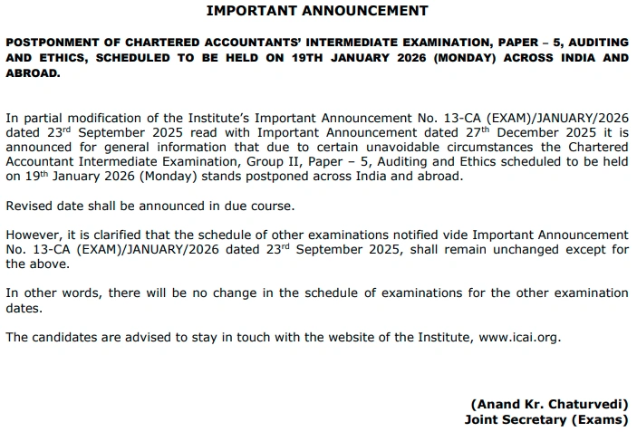The Institute of Chartered Accountants of India (ICAI) has postponed the CA Intermediate Group II Paper 5 – Auditing and Ethics exam, which was originally scheduled for January 19, 2026. This decision will affect students in India and abroad. The ICAI has cited "unavoidable circumstances" for this change.