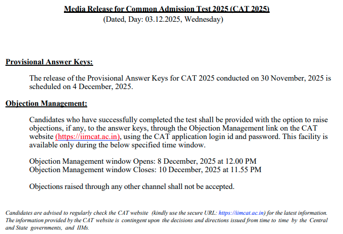 According to the official notification shared, candidates who have completed the test shall be provided with the option to raise objections, if any, to the answer keys, through the Objection Management link on the CAT website iimcat.ac.in.