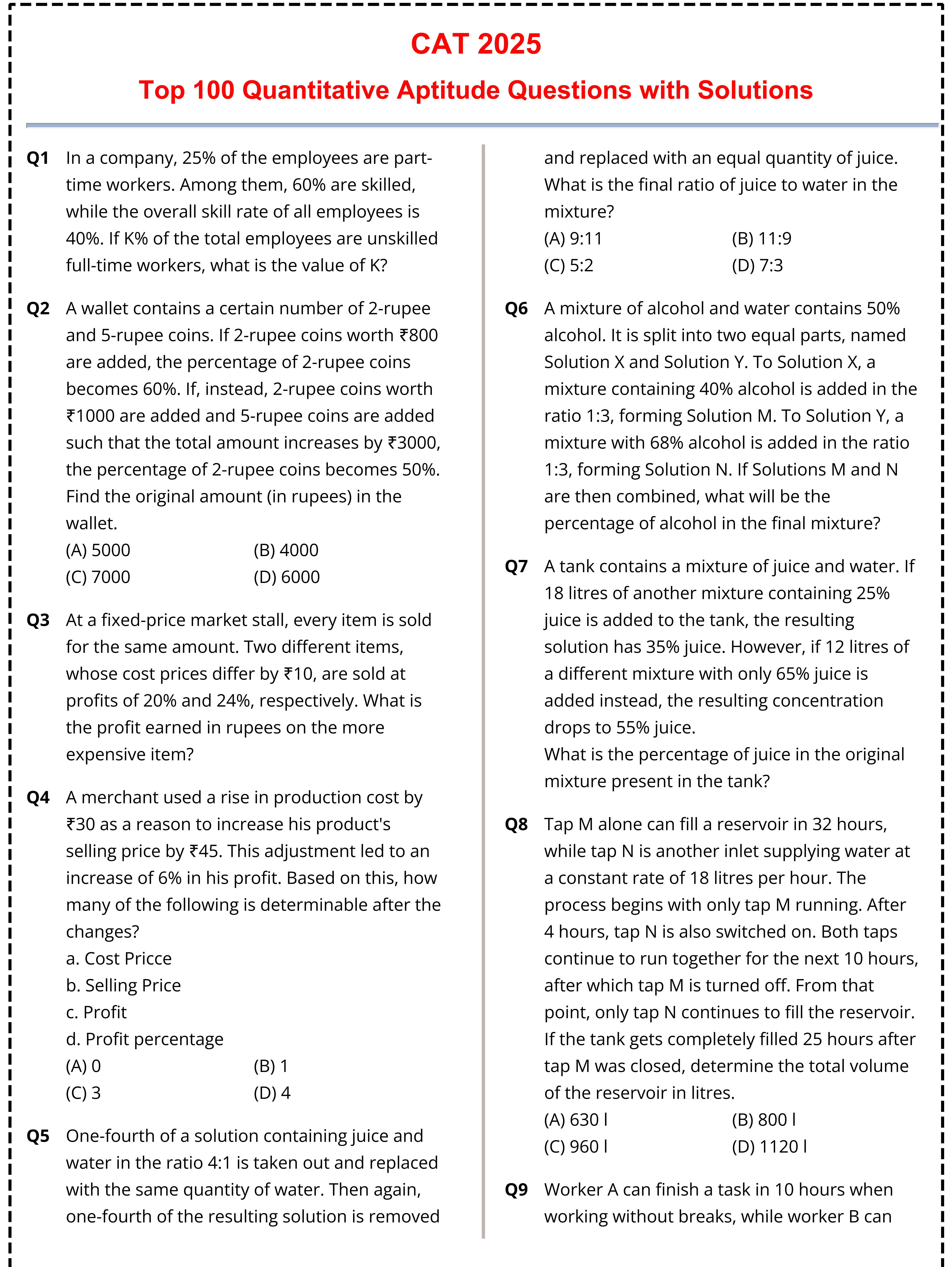 👉 Download PDF- Top 100 CAT 2025 Quantitative Aptitude (QA) Questions and Solutions PDF