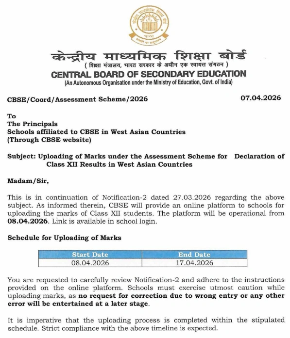 In an official notification issued on April 7, CBSE informed school principals that the online marks upload portal became operational from April 8, 2026. Schools can access the portal through their respective school logins.