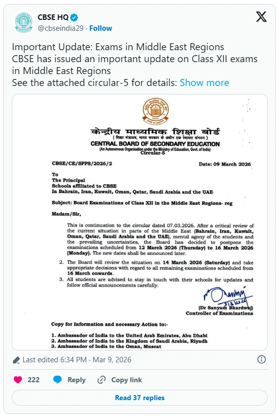 CBSE Controller of Examinations Sanyam Bhardwaj stated that the decision was made after a thorough review of the current situation in parts of the Middle East—Bahrain, Iran, Kuwait, Oman, Qatar, Saudi Arabia, and the UAE.