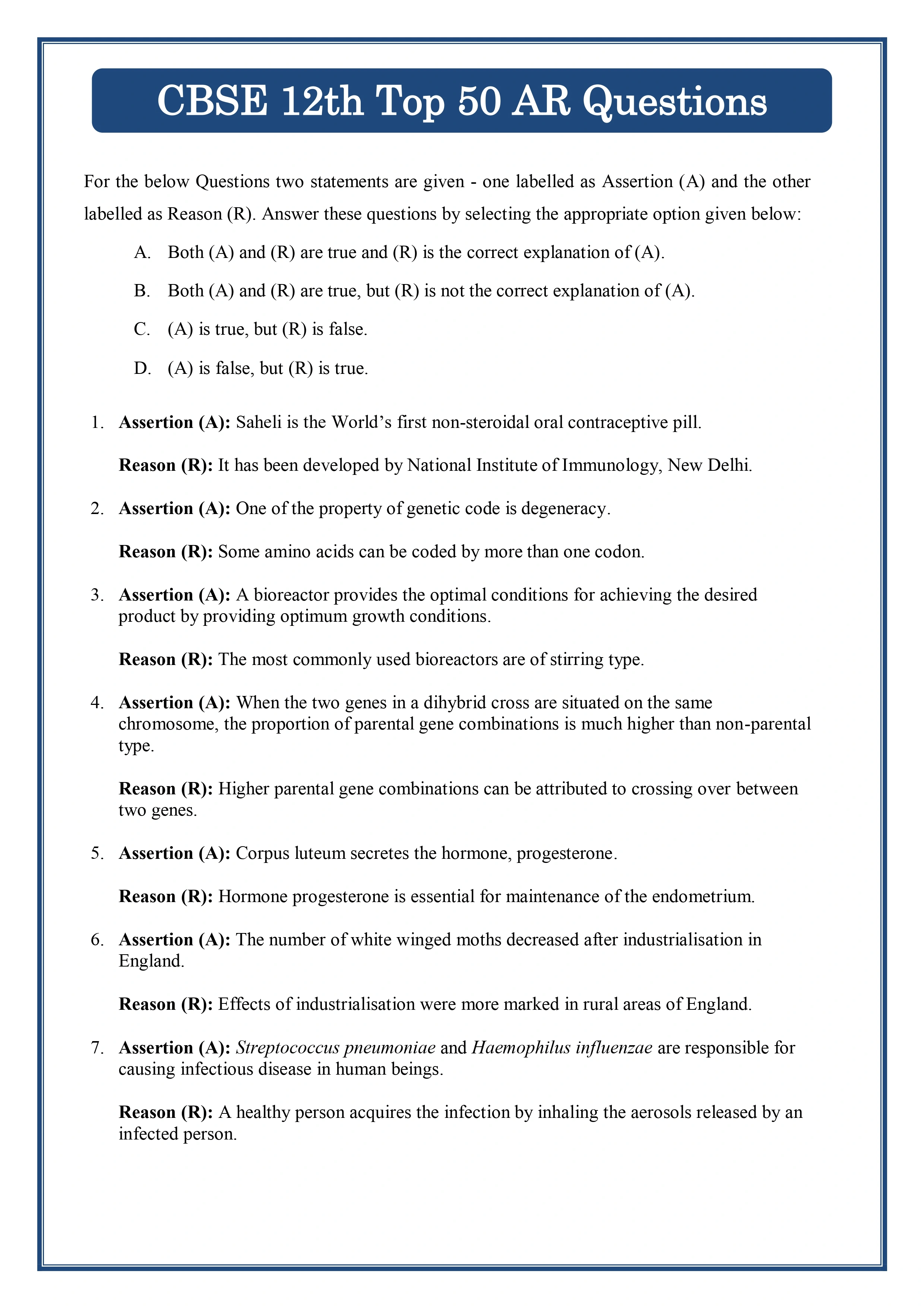 | Download PDF CBSE 12th Biology Top 50 Assertion Reason Questions 2025-26 |