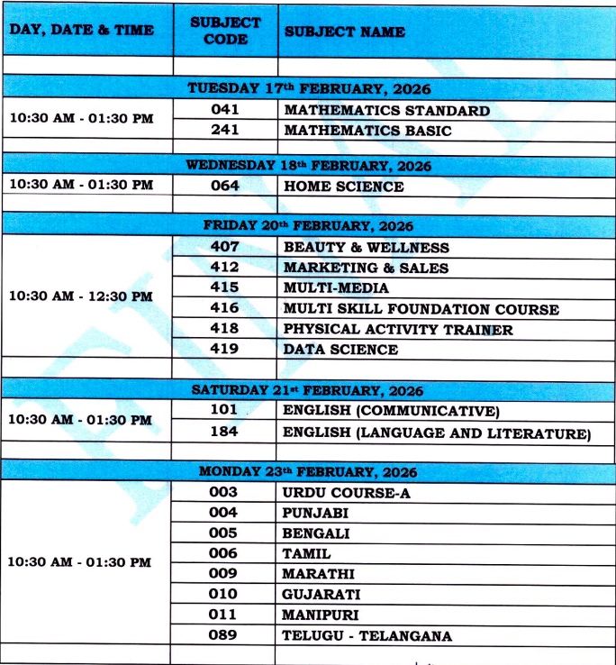 👉 Download PDF - CBSE Class 10th Exam Schedule 2026