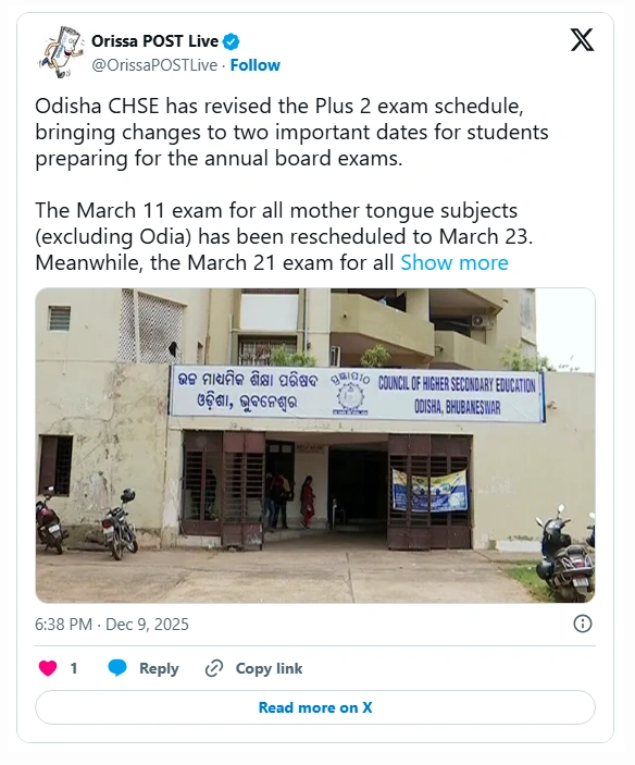 The Council of Higher Secondary Education (CHSE) Odisha has revised the Odisha CHSE Time Table 2026, resulting in two important changes for Class 12 students. The examination for all Modern Indian Languages (except Odia), which was previously scheduled for March 11, 2026, will now be held on March 23, 2026. The examination scheduled for March 21, 2026, for all streams – Science, Commerce, and Arts – has been postponed to March 25, 2026.