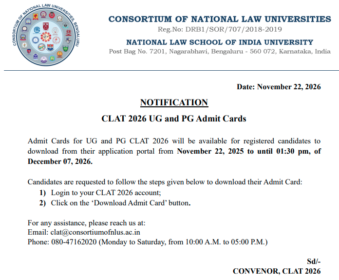 The Consortium of NLUs has released the Common Law Admission Test Admit Card 2026 today, November 22, 2025, through online mode.