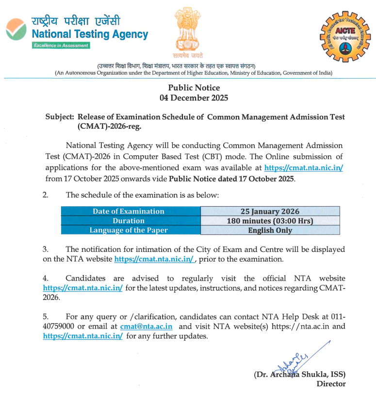 The National Testing Agency (NTA) has announced the dates for the Common Management Admission Test (CMAT) 2026. The exam will be held on January 25, 2026, and will take place online in CBT mode. The exam paper will be available only in English.