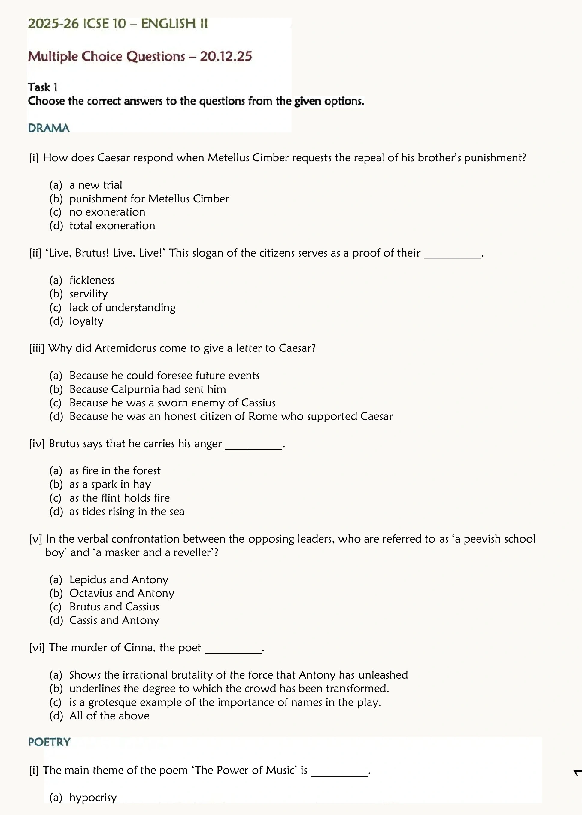 ICSE Class 10 English Paper-2 Important Questions 2025-26