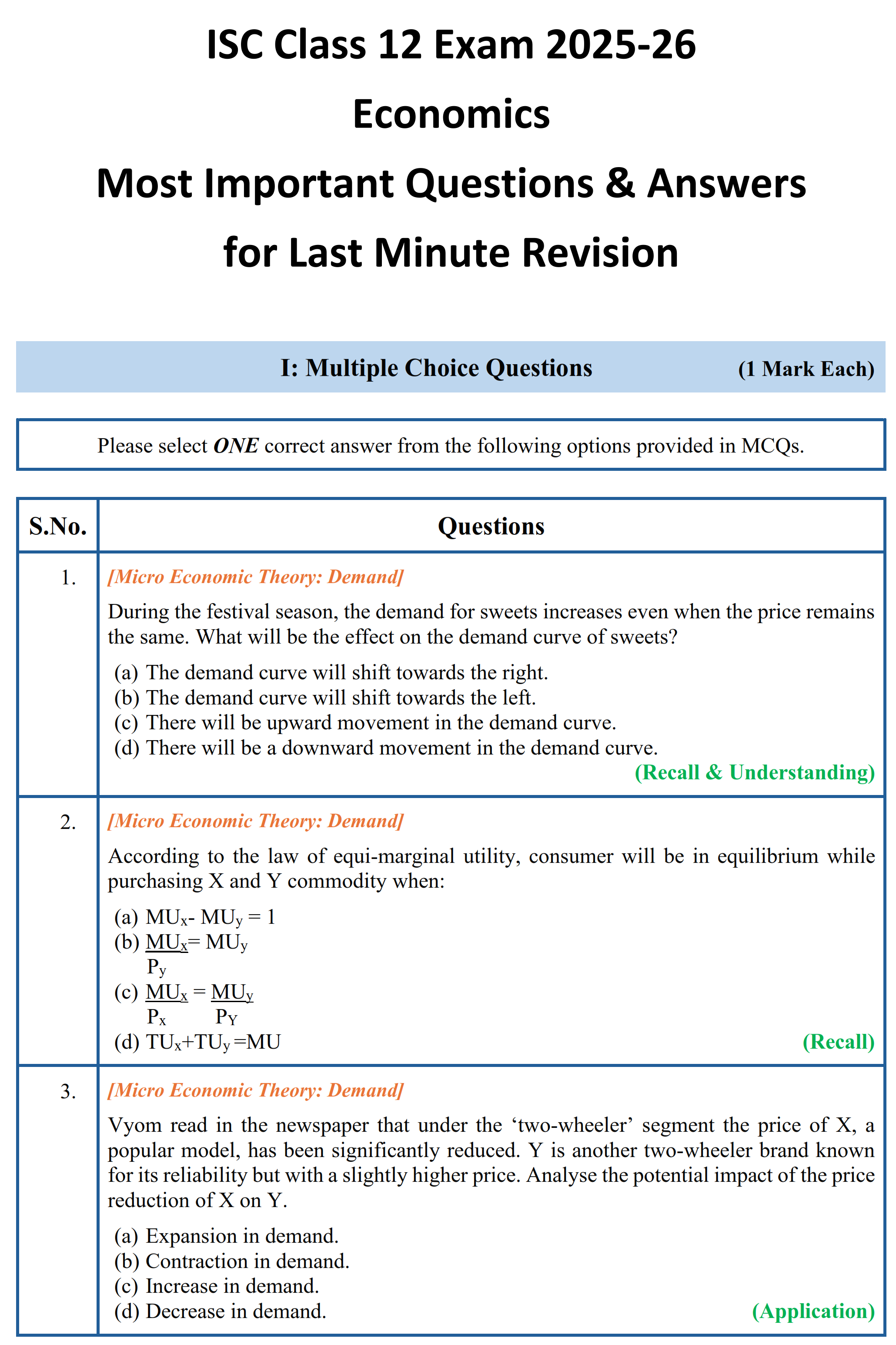 | ISC Class 12 Economics Most Important Questions with Answers PDF |