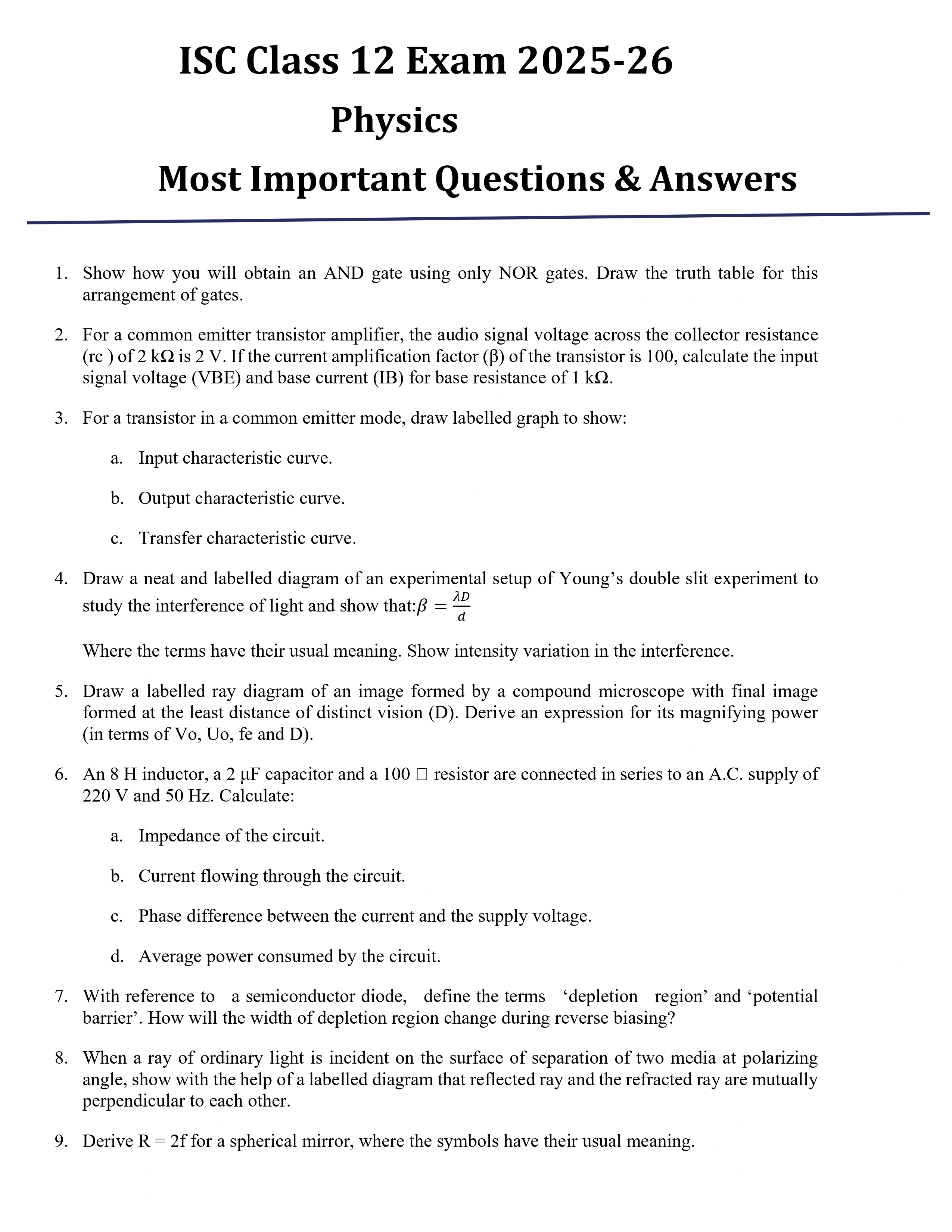 | ISC Class 12 Physics Most Important Questions with Answers PDF |