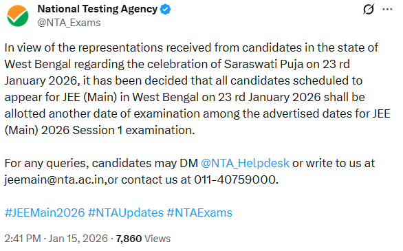 The NTA announced this a few hours ago on X (formerly Twitter). The reason? Saraswati Puja is on January 23rd, and students in the state were requesting a different date.