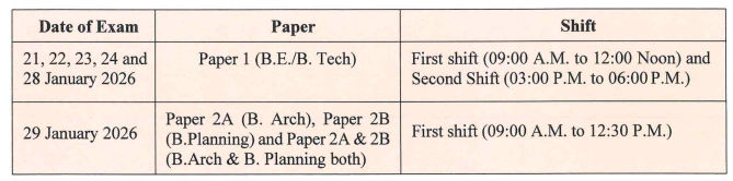 | January 28, 2026 | Paper 1 (B.E./B.Tech) | Shift 1: 9:00 AM - 12:00 Noon |