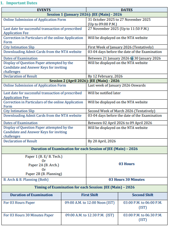 Candidates preparing for JEE Main 2026 should complete their registration before the November 27 deadline and keep checking the official website for any further updates.
