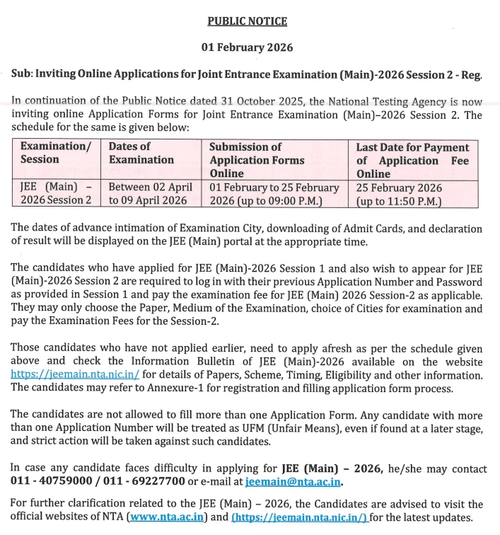 The JEE Main Session Two exam for BE/BTech, BArch/BPlanning programs is scheduled to be held between April 2 and 9, 2026. Registration for JEE Main Session Two is likely to begin today, January 31. Candidates interested in applying for JEE Main Session Two can apply on the official website jeemain.nta.nic.in.