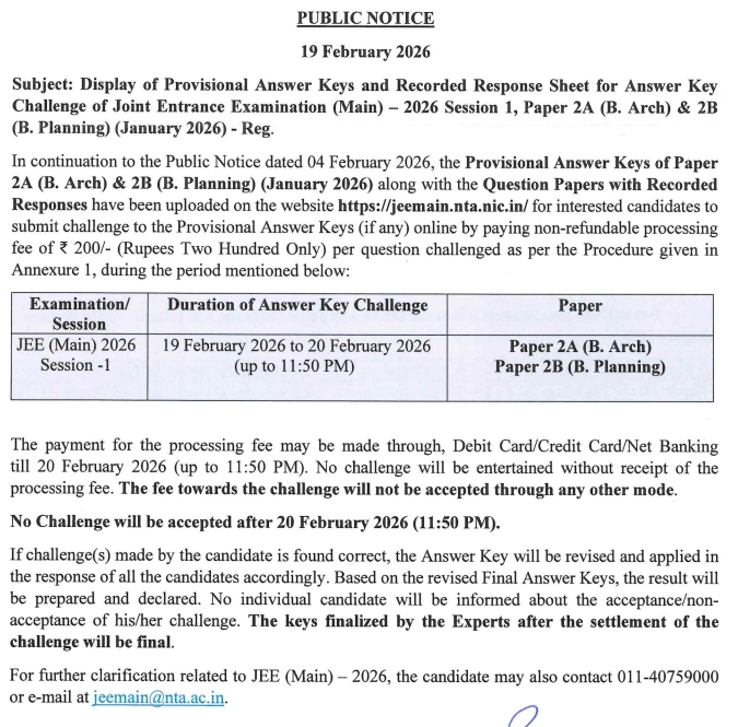 The National Testing Agency (NTA) has released the JEE Main 2026 answer key for Paper 2. Candidates who appeared for Paper 2A (B. Architecture) and 2B (B. Planning) of the Joint Entrance Examination can view the provisional answer key through the official JEE Main website, jeemain.nta.nic.in.