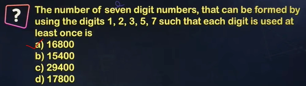 | 9. Number of seven digit number formed by using the digits 1, 2, 3, 4, 5 atleast once are | 16800 |
