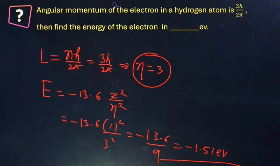 | 24. The orbit angular momentum of e in n th shell of H atom is 3h/π. The total energy of e is | -0.38 eV |