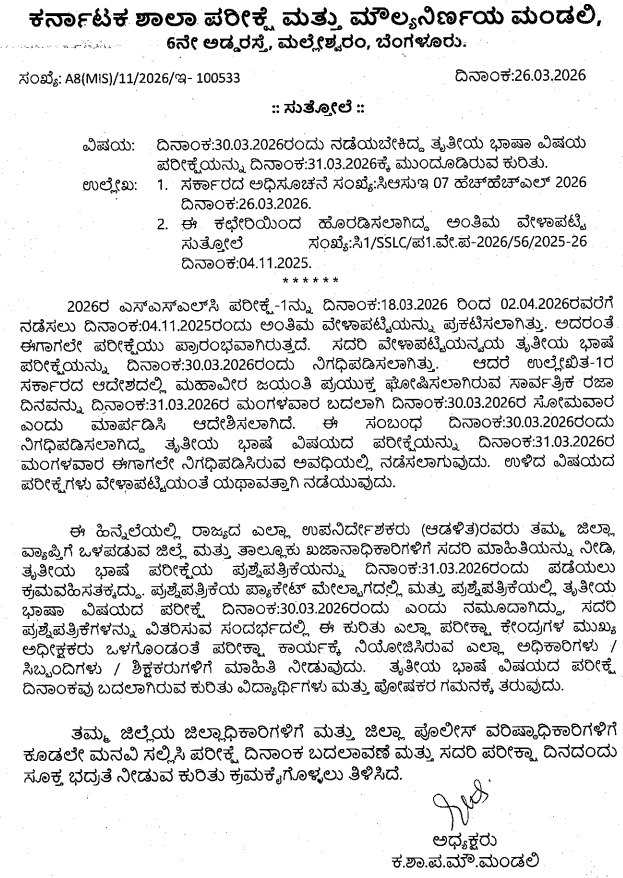 The Karnataka School Examination and Assessment Board revised the examination date following the State Government's decision to change the date of Mahavir Jayanti from March 31 to March 30. The official notification (originally in Kannada) states: "For the SSLC Examination 2026, the previously scheduled examination dates—spanning from March 18, 2026, to April 2, 2026—will remain largely unchanged."