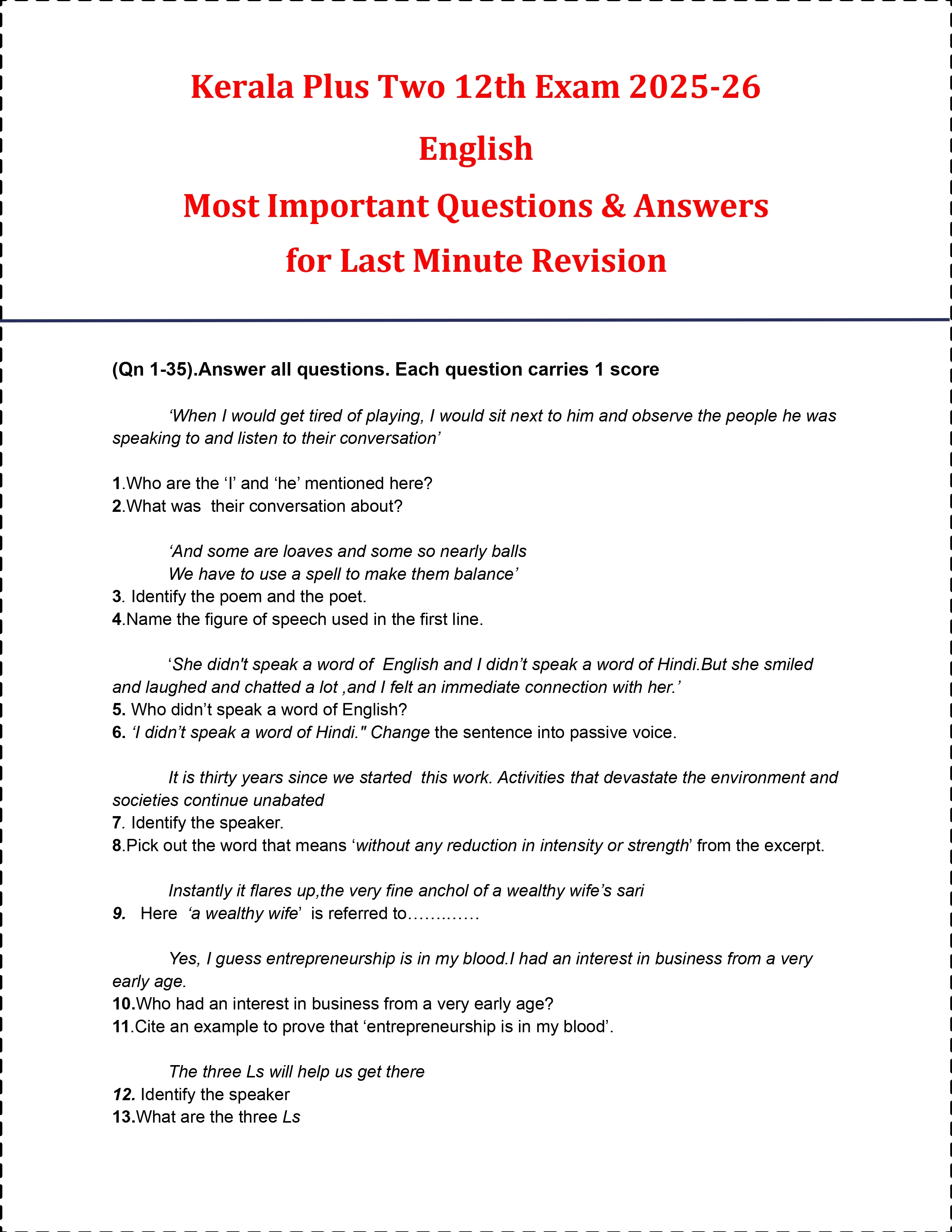 | Kerala Board Plus Two English Most Important Question PDF |