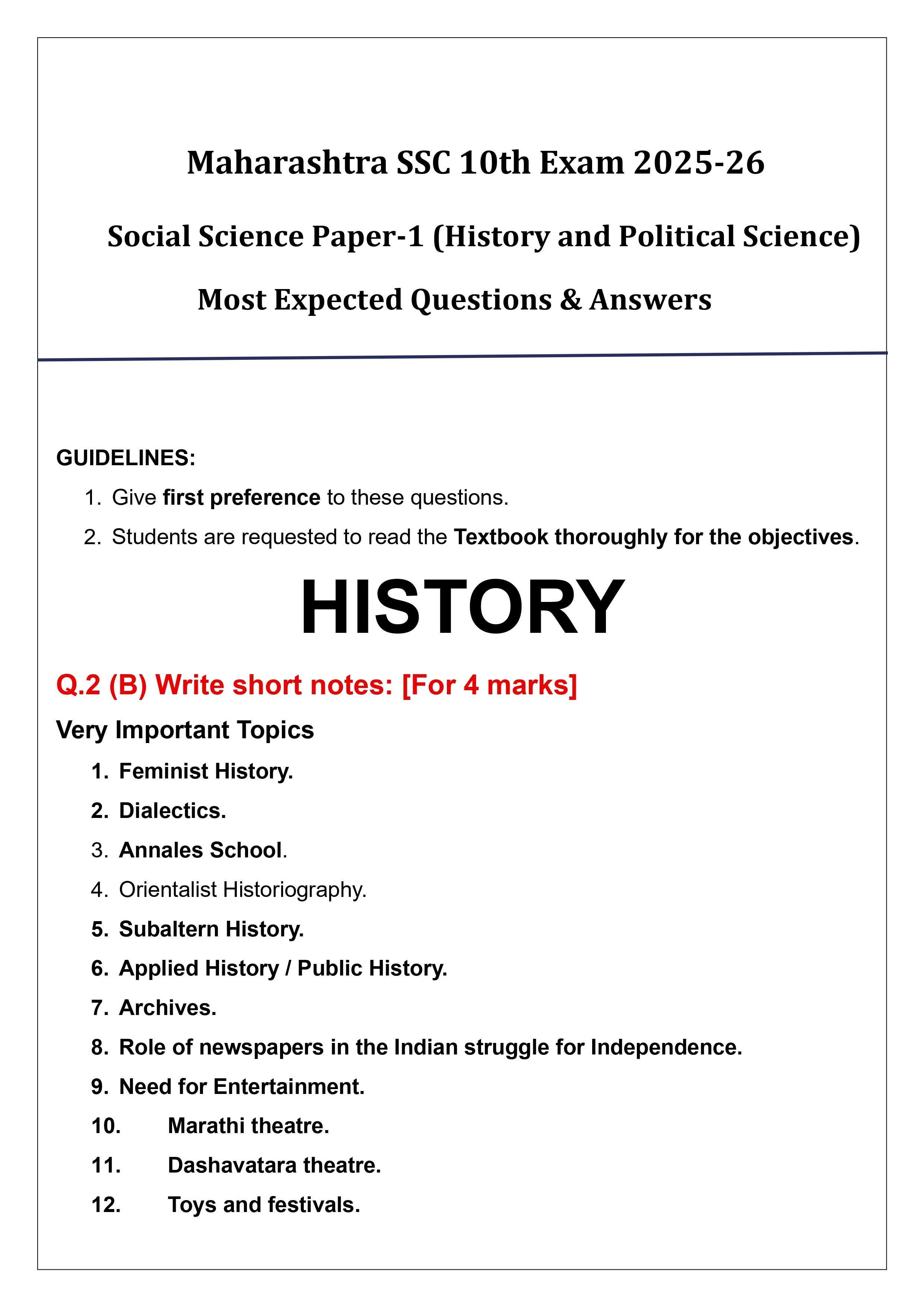 Maharashtra Board SSC Social Science Paper-1 2025-26: Top Expected Questions & Answers