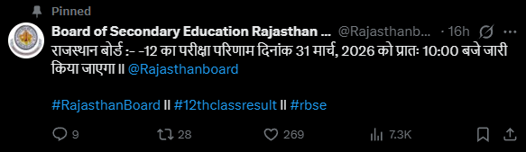 राजस्थान बोर्ड (RBSE) कक्षा 12वीं का रिजल्ट 2026 आज यानी 31 मार्च 2026 (मंगलवार) को सुबह 10 बजे जारी किया जाएगा। राज्य के शिक्षा मंत्री मदन दिलावर ने इसकी आधिकारिक पुष्टि कर दी है। इस बार RBSE कक्षा 12वीं की परीक्षा में रिकॉर्ड 910,009 छात्र शामिल हुए थे।