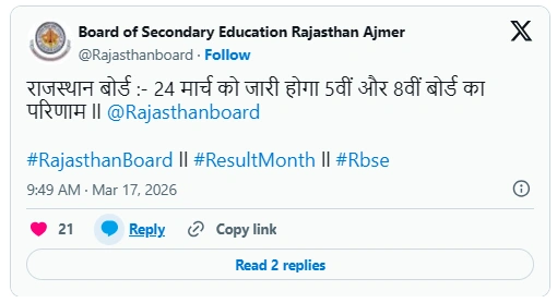 माध्यमिक शिक्षा बोर्ड, राजस्थान ने RBSE कक्षा 5 और कक्षा 8 के 2026 के नतीजों की घोषणा की तारीखें पक्की कर दी हैं। सोशल मीडिया पर एक पोस्ट के मुताबिक, RBSE 5वीं और 8वीं के 2026 के नतीजे बोर्ड के अधिकारी 24 मार्च, 2026 को घोषित करेंगे। जिन उम्मीदवारों ने परीक्षा दी है, वे अपने नतीजे rajeduboard.rajasthan.gov.in या rajshaladarpan.rajasthan.gov.in पर देख सकते हैं।
