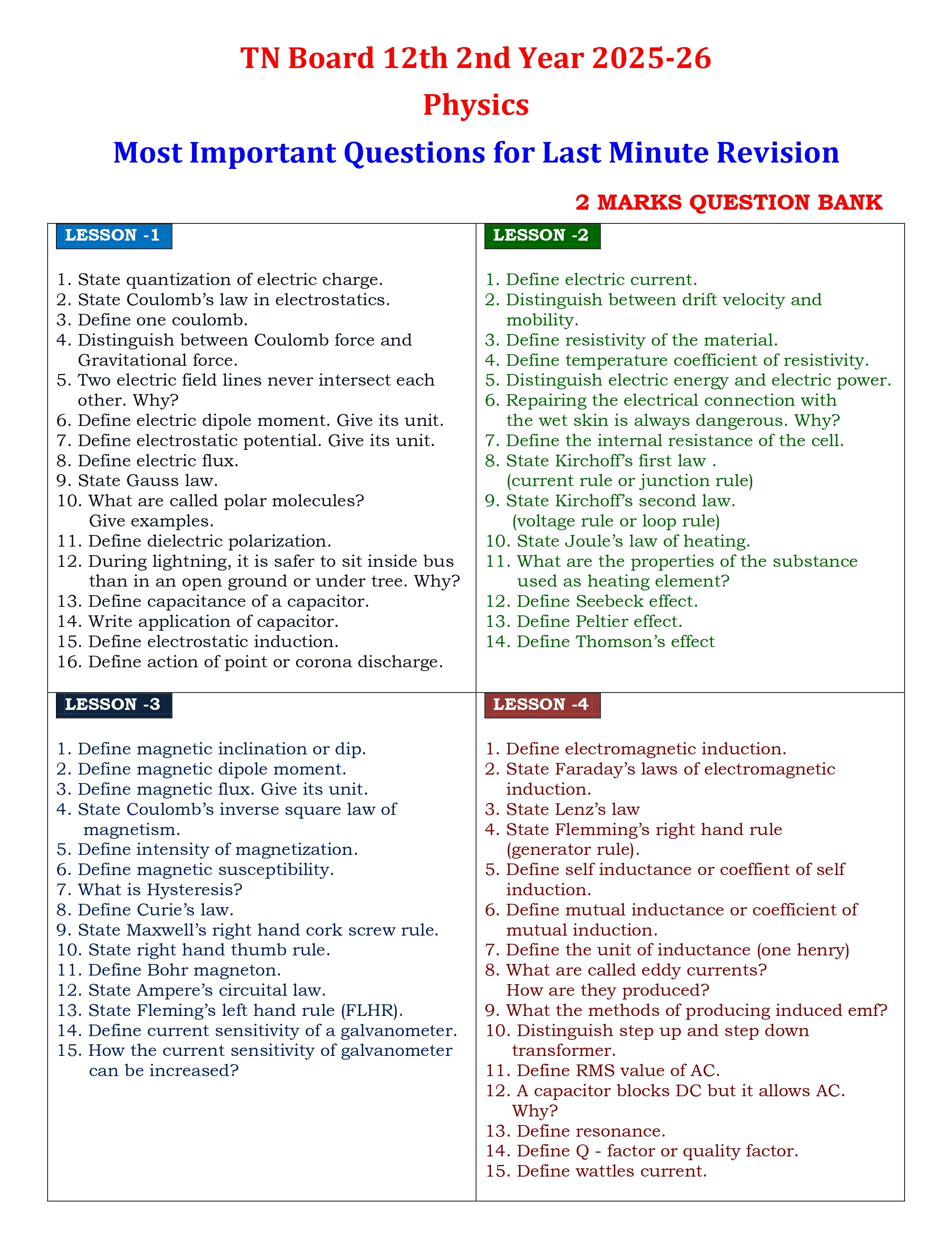 | Download PDF TN Board 12th Physics Important Questions 2025-26 |